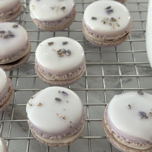 This is the fun part! I love the look of the dried icing on the macarons with the lavender sprinkled on top. It’s so beautiful! It’s really simple to achieve. Just mix 1 cup of powdered sugar and 5 teaspoons of milk. It will make the glaze just thin enough, but not so thin that it won’t dry nicely on the shells. Once you’ve made the icing, transfer it to a small ramekin. This makes dipping the macarons easier. Dip the top of the macaron in the icing. Just the top, you don’t want to go down to the feet. Pull the macaron out of the icing and let the icing drip off until it slows down. It takes only a few seconds. Turn the macaron over and make a circular motion with it to prevent the icing from running down the sides as the icing starts to solidify. It’s ok if there’s a little bit of drippage, in my opinion, it adds some character. Once you notice the icing is starting to solidify, set it down. Sprinkle it with a bit of culinary lavender buds for a beautiful decoration.