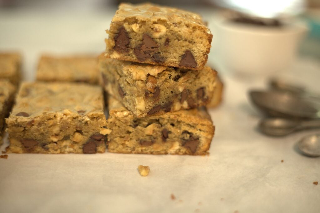 These blondies are easy to make and come together in no time, in one bowl and with only a whisk and a spatula; they are perfect for a weeknight when you need your sweet fix yet don’t have a ton of time to whip something up. Loaded with chocolate chips and hazelnuts, these blondies are sure to hit anyone’s sweet spot.