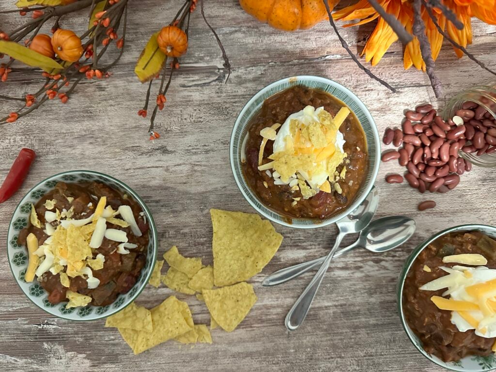 I really think that is up to you. Although chili is more of a stew rather than a soup, some chili is thicker than others. This chili is neither too thin nor very thick. It doesn’t have a long simmer time, but it’s long enough to get the job done without taking all night. This is definitely a chili you can get on the table in under an hour. If you would like to simmer for longer, that is perfectly fine.