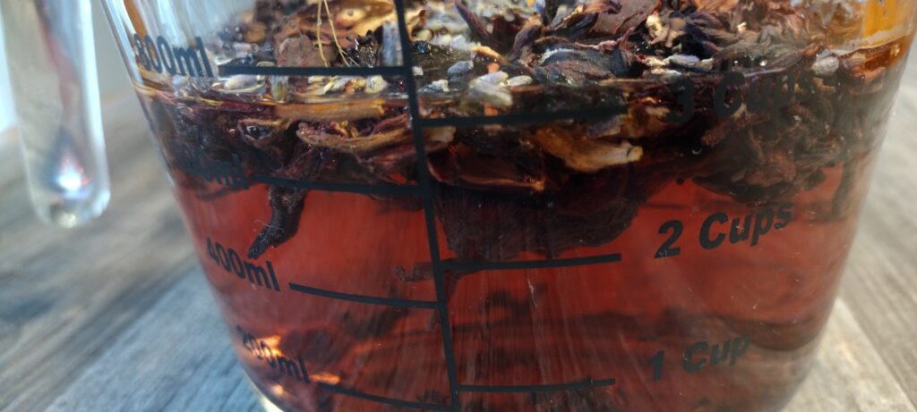 - In a 4 cup measuring cup, add 1 cup dried hibiscus, 1 tbsp dried lavender, 3 cups water. Microwave 4 minutes, let steep for 20 minutes.