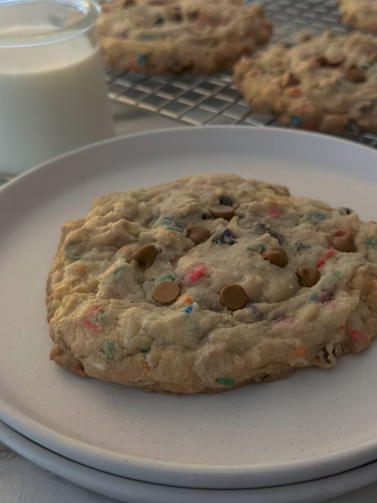This recipe uses my standard chocolate chip cookie recipe, then I just throw all the add-ins in. Simple and quick. I also made these cookies about twice the size of normal cookies, cause who doesn’t want a giant cookie? Feel free to make them regular size though.