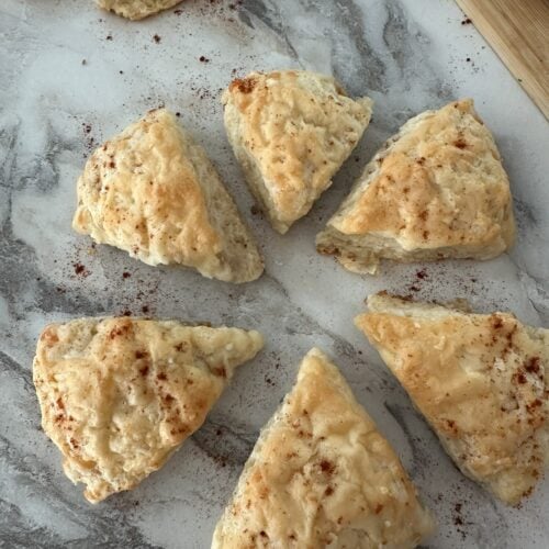 - To freeze before baking, make the scones all the way through slicing the scones. Freeze flat on a tray, then wrap individually in plastic wrap and tinfoil and store in a freezer-safe container. Freeze for up to 3 months. If you want to freeze the discs, wrap them in plastic wrap then tinfoil before freezing as well. Thaw out overnight in the fridge before slicing into triangles. When you’re ready to bake them, if baking from frozen, bake at the regular temperature and add 1-2 minutes to the baking time. You can also thaw them out in the fridge overnight and bake at the regular time and temperature.