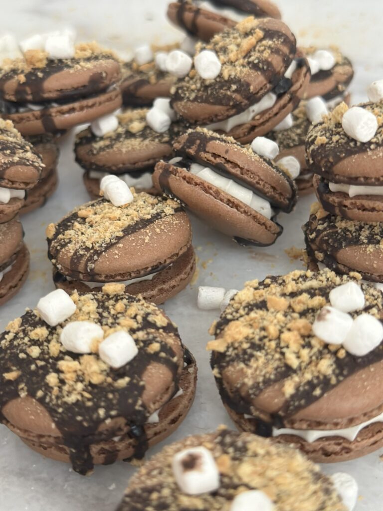 - Using a spoon, or a small squeeze bottle with a tiny tip, drizzle the chocolate sauce over the macs. I prefer the free-form look of using the spoon, but if you want more precision and cleaner lines, use the squeeze bottle. Sprinkle crushed graham crackers over the macarons. Some will soak into the chocolate, which is great. You can add more so you get the visual effect of the graham crackers on top as well as the flavor. Place a few small marshmallows on the chocolate drizzle before it dries to help them stick.