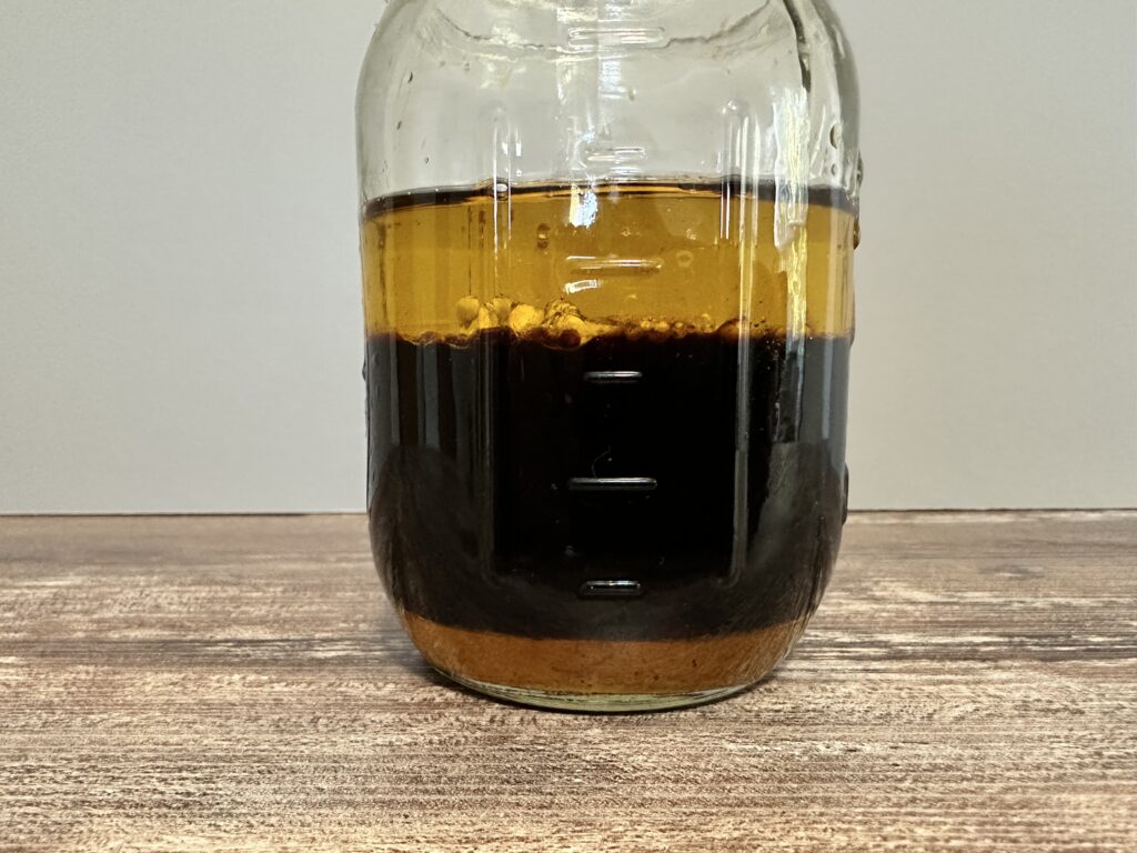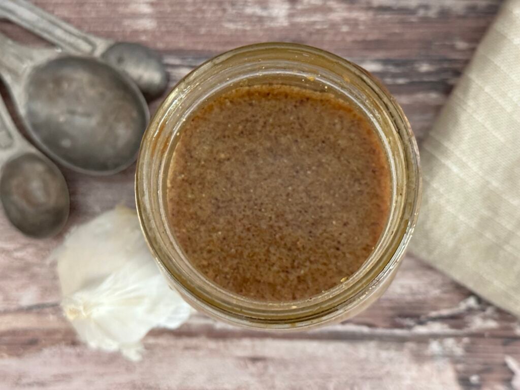 This recipe couldn’t be more simpler. Essentially, you are just measuring everything into a mason jar, or something like it, putting a lid on it and shaking it up until everything has been emulsified, or incorporated together.