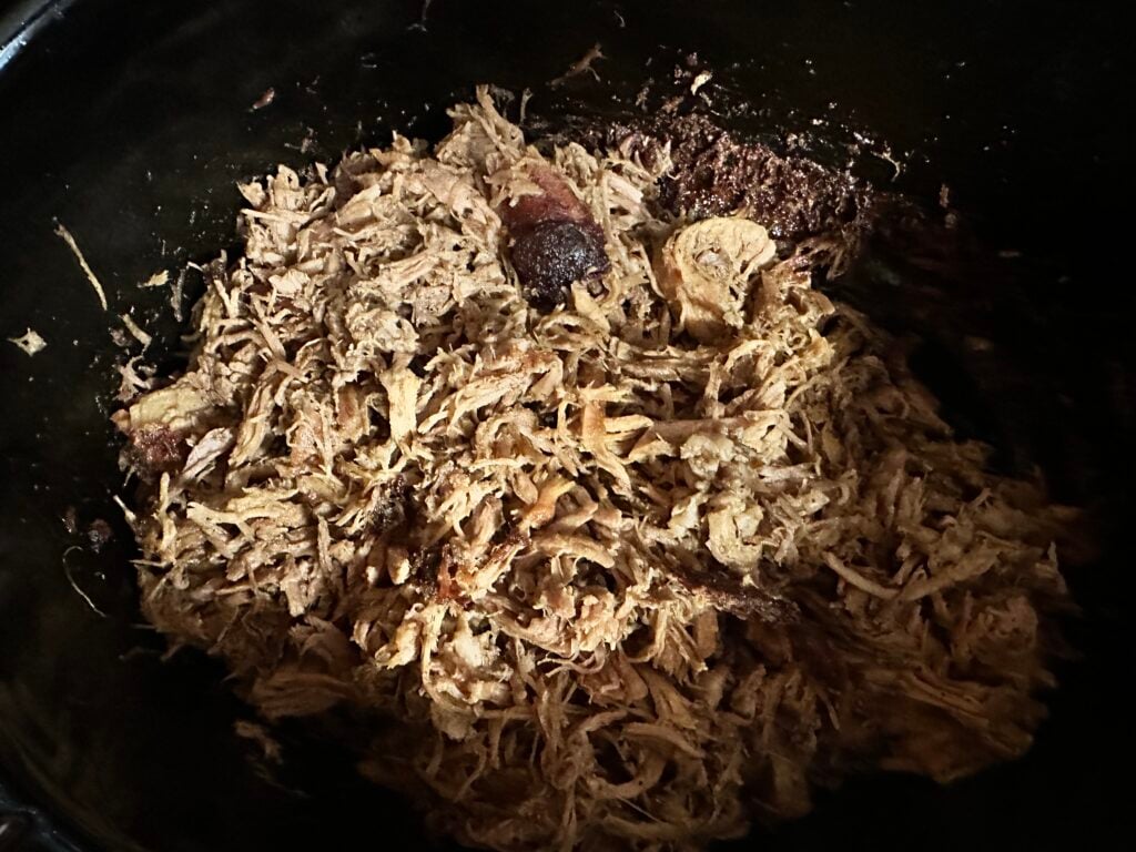 This shredded pork is so good, you won’t want to cook pork any other way. First, you’re going to add the pork shoulder to your crock pot. Add the spices and orange juice and one cup of water. Then, the crock pot does the work. It is so wonderful walking into your house when this pork is cooking. Smells so so good! Once the pork is done, I like to shred it directly in the pot. This will allow the juices to get all over the meat and roast in it, soaking up all those delicious spices. Before you shred the meat, take its temperature by inserting a meat thermometer through the thickest part. It should read 170 degrees. I like to let the shredded meat simmer in the juices for about 30 minutes. And of course, I have to take a few bites. Yum!